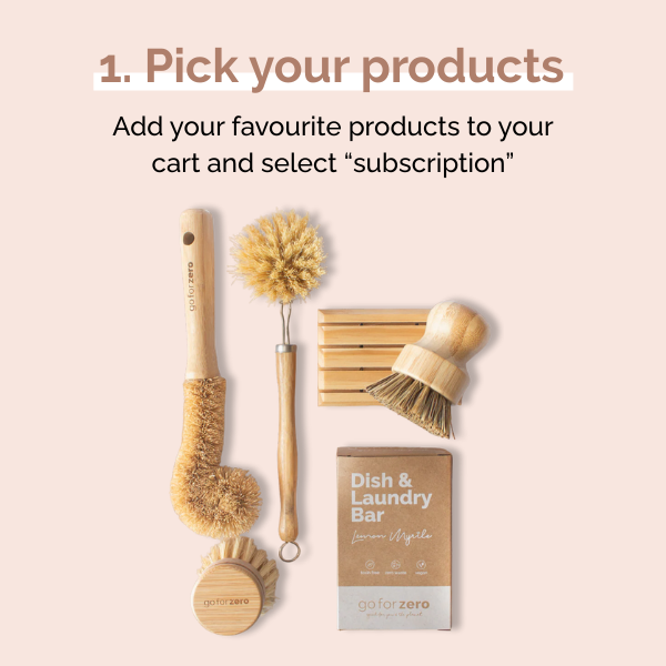 Subscriptions are currently available on Go For Zero branded products only(like our dish and laundry blocks, bamboo brushes, plastic-free dish cloths, and more). You can see them all here.