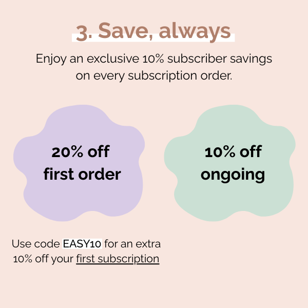 You save10% on every subscription order, not just your first one. There are no contracts or minimum commitments.