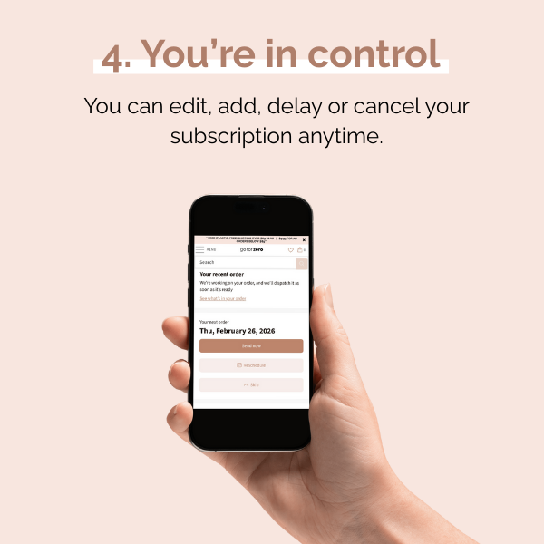 A Go For Zero subscription helps your sustainable habits stick by sending you your favourites on repeat, without delay or effort.